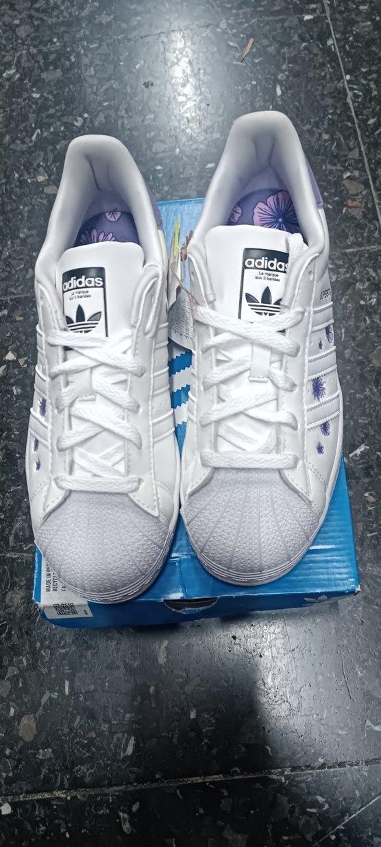 Beyaz Adidas kadın spor ayakkabısı, renkli çiçek desenleri ve bağcıklı tasarıma sahip, kauçuk tabanlıdır. Spor ve sokak stiline uygundur.