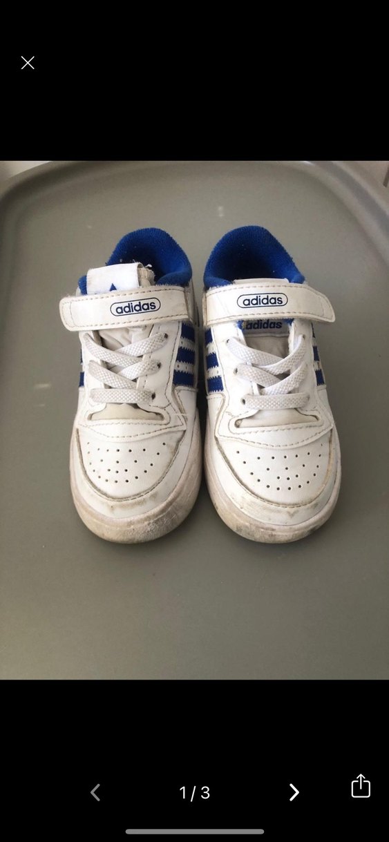 Mavi şeritli, cırt cırtlı beyaz Adidas erkek çocuk spor ayakkabısı. Kauçuk tabanlı, sokak stili için uygun. Rahat ve kullanımı kolay. 20-21 numara