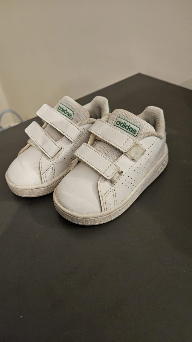 Beyaz renkte, Adidas marka, cırt cırtlı ve kauçuk tabanlı erkek çocuk spor ayakkabısı, gündelik kullanıma uygun.