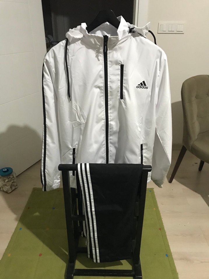 Beyaz Adidas erkek eşofman takımı regular fit, uzun kollu ve fermuarlı. Sentetik kumaştan, sade tasarımlı, dış mekan için uygun.