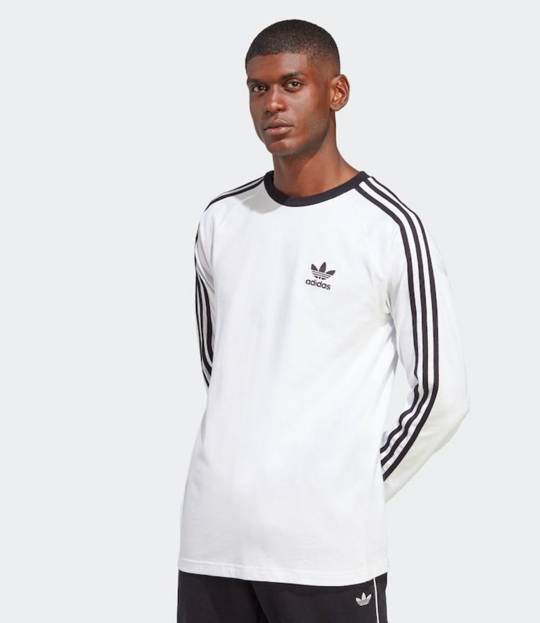 Beyaz Adidas erkek uzun kollu tişört, pamuk kumaştan, rahat kesim ve kol boyunca şerit desenlidir. Spor ve günlük kullanım için uygundur. ⚽