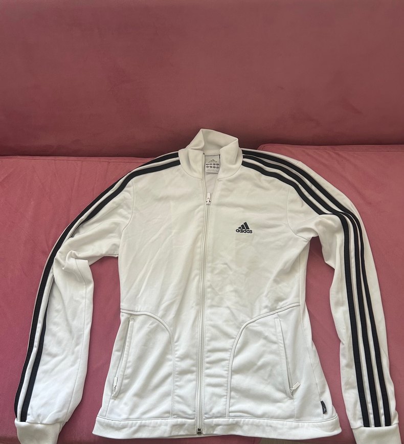 Beyaz Adidas ceket, yüksek yakalı ve uzun kollu, siyah şerit detaylıdır. Almanyadan alınmıştır