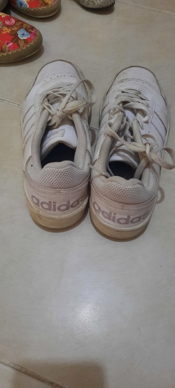 Beyaz Adidas kadın sneaker, bağcıklı, spor ve günlük sokak stili için uygundur. Kauçuk tabanlıdır.