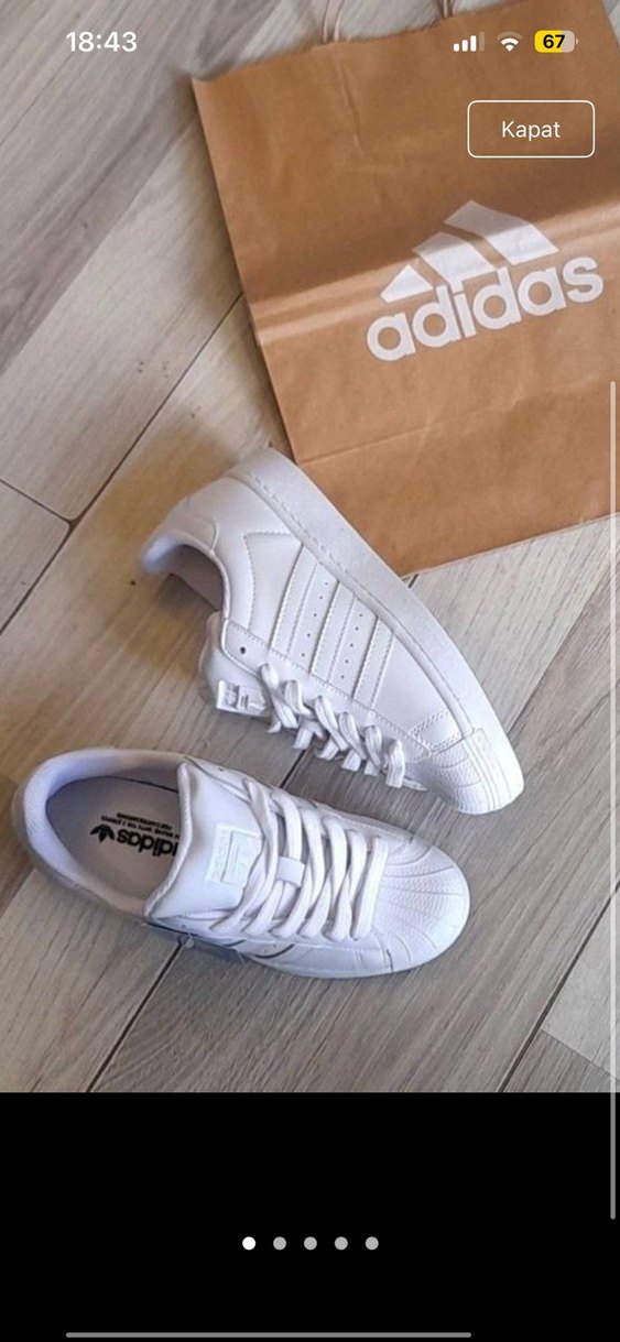 Beyaz, desensiz Adidas kadın spor ayakkabısı, düz kauçuk tabanlıdır. Rahat ve şık athleisure tarzı için uygundur. 1-2 kere giyildi