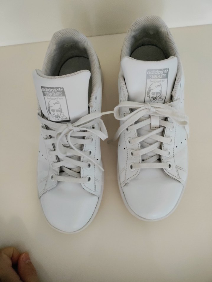 Beyaz Adidas kadın spor ayakkabısı, düz tabanlı ve desensiz tasarıma sahip. Dayanıklı kauçuk malzeme ve gri detaylarla sportif ve rahat tarz için ideal.Yıkadım tertemiz.