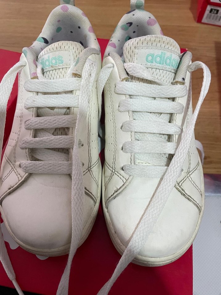 Beyaz Adidas kız çocuk spor ayakkabısı, dolgu topuk ve bağcık detayına sahip. Kauçuk taban dayanıklılık sağlar, pastel renk vurguları ise şıklık katar. 30 numara spor ayakkabı.