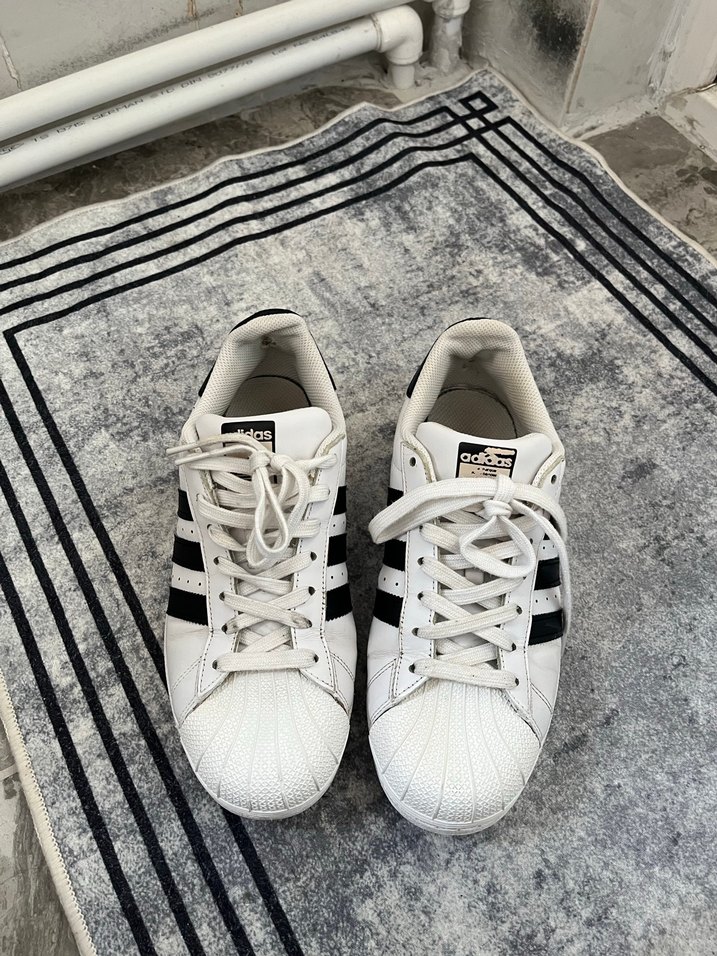 Adidas beyaz kadın spor ayakkabısı, düz taban ve siyah şeritlerle. Rahat ve sıcak tutan fleece astarlı, sportif ve trend görünümlü. ♀️