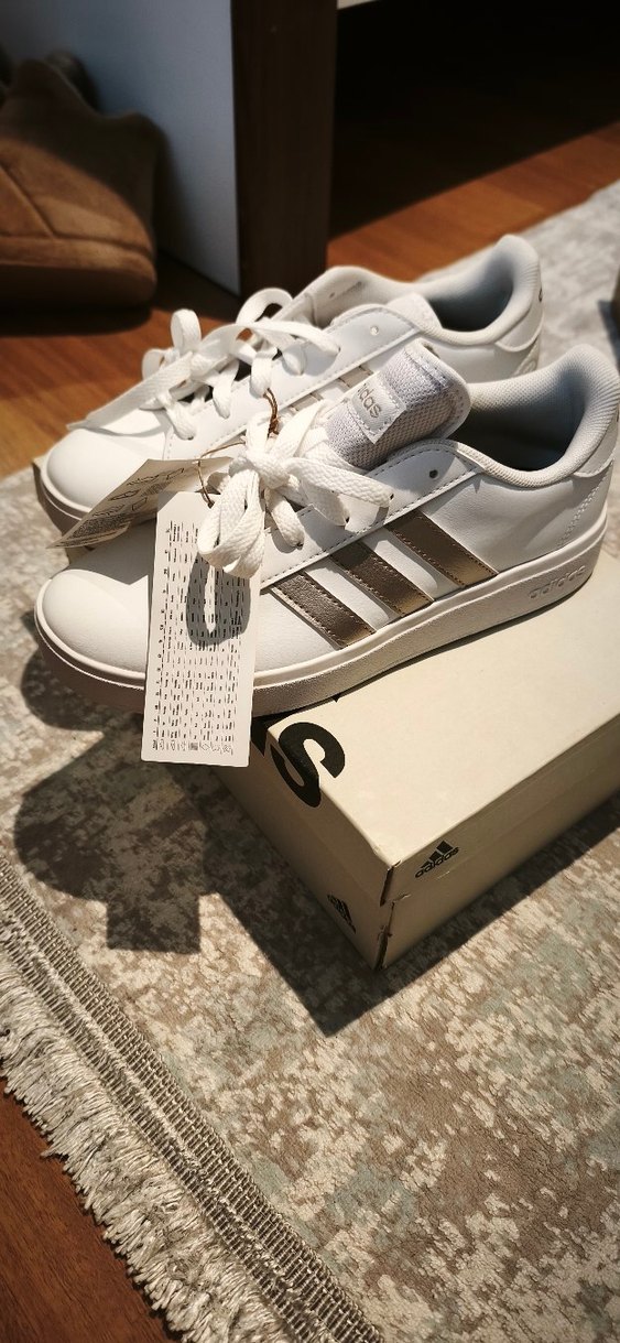 Beyaz Adidas spor ayakkabılar, gri baskılı şeritler, yüksek topuk ve kauçuk taban ile sportif sokak stili için uygundur.