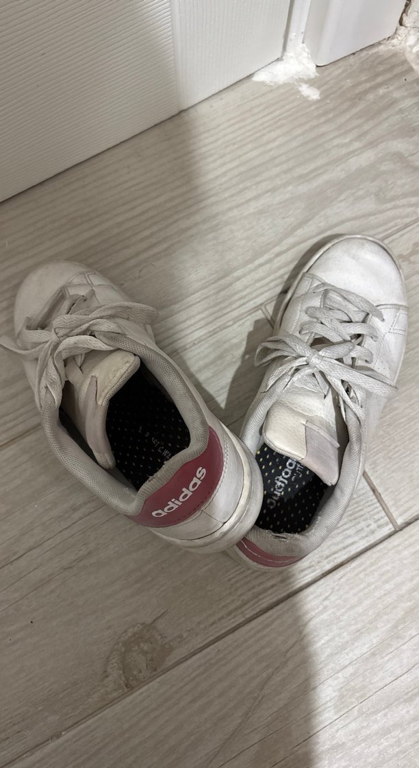 Beyaz Adidas kadın spor ayakkabısı, ince topuk ve cırt cırt detaylı, trend günlük ve spor giyime uygun. Gri detaylı, desensiz tasarıma sahiptir.