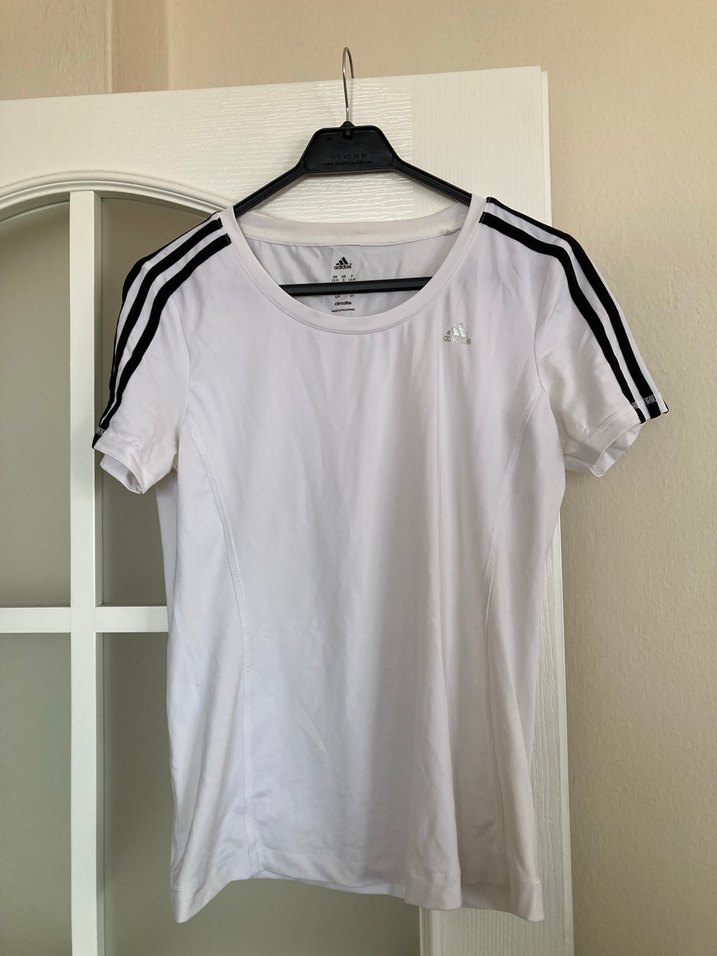 Beyaz Adidas esnek tişört, kısa kollu ve yuvarlak yakalıdır. Orijinal Adidas tshirt mağazadan alındı.