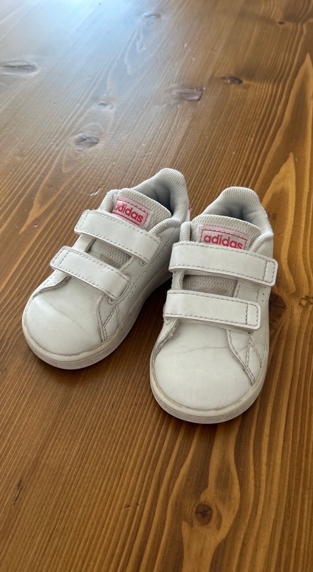 Beyaz Adidas kız çocuk spor ayakkabısı, cırt cırtlı ve kauçuk tabanlı, sade ve deseniz tasarıma sahip pastel tonlarda. Rahat ve kullanımı kolay.