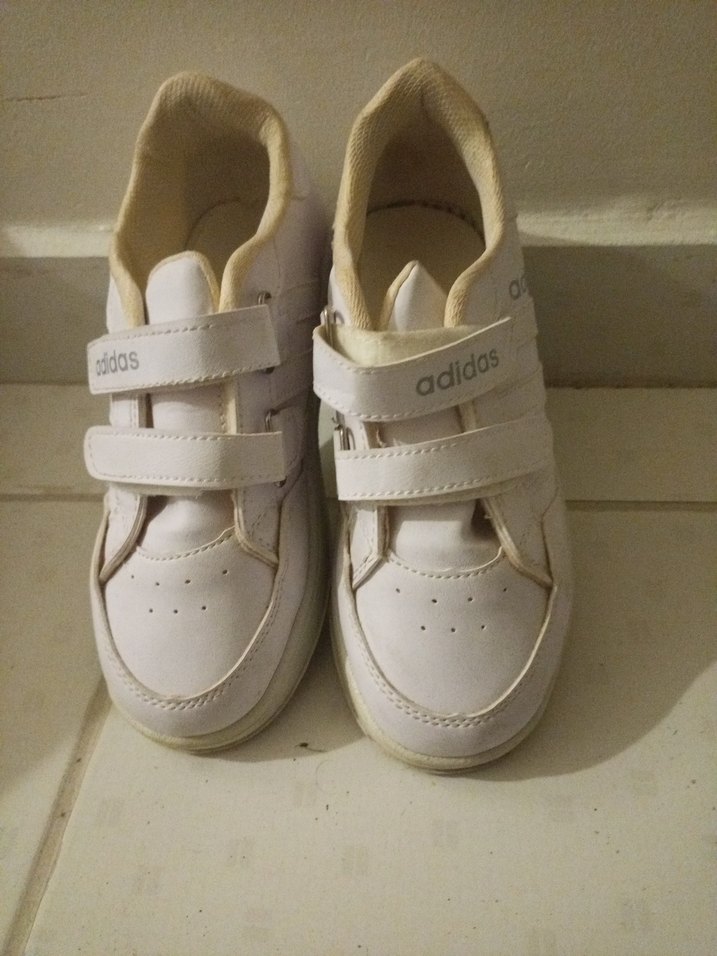Beyaz Adidas kız çocuk spor ayakkabısı, kolay giyimi sağlayan cırt cırtlı bantlara ve kauçuk tabana sahiptir. Düz, desensiz tasarımıyla sokak stiline uygundur. ürün çok az kullanıldı Herhangi bir sorun yoktur