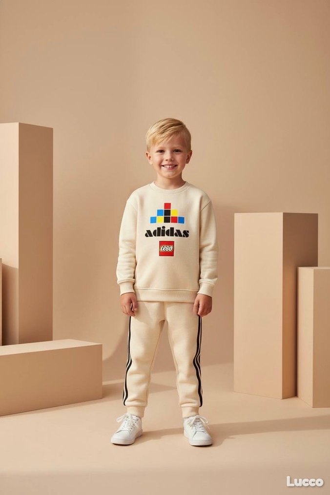Beyaz renkli Adidas Lego baskılı erkek eşofman takımı, rahat kesimli ve yumuşak, sıcak tutan kumaştan üretilmiştir. Sweatshirt yuvarlak yakalı, pantolonlarda siyah şeritler bulunur.