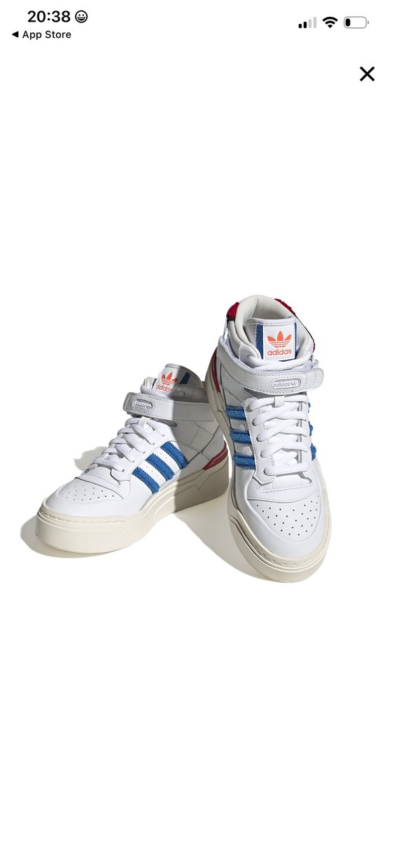 Beyaz Adidas spor ayakkabı, mavi çizgili detaylar ve cırt cırtlı bantlarla güvenli kullanım sağlar. Dayanıklı kauçuk tabanlı, sportif sokak stili için uygun.
