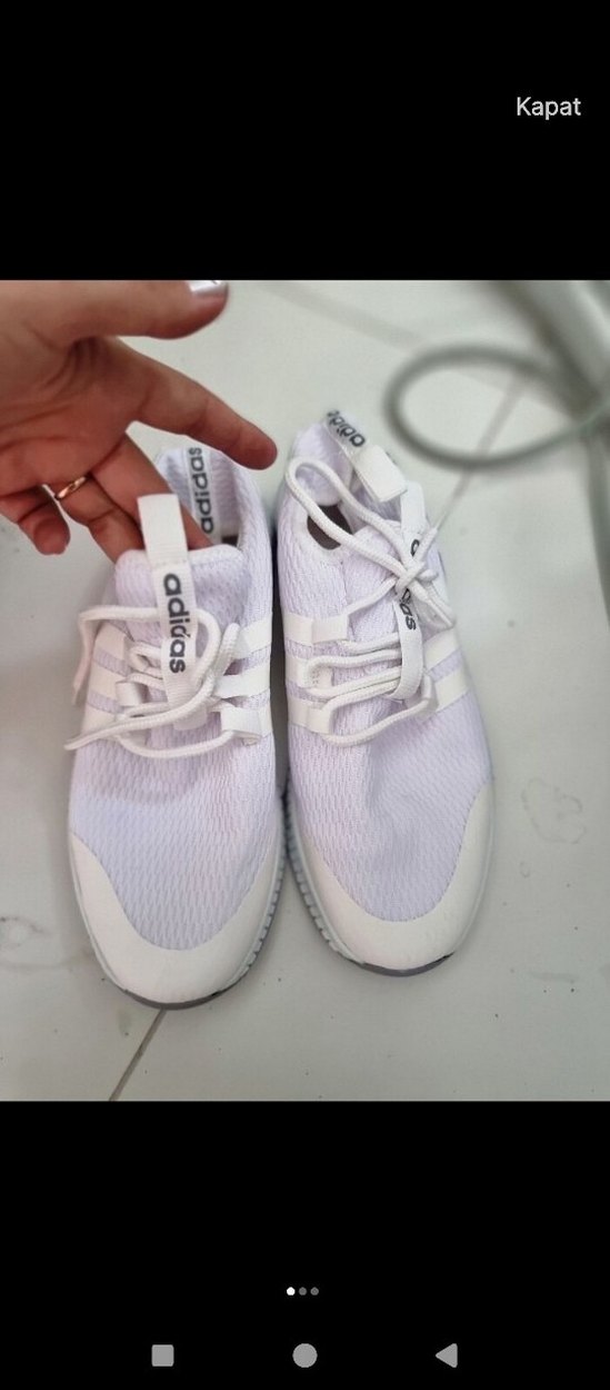 Beyaz Adidas spor ayakkabısı, velcro ve bağcıklı kapanışlı, ince topuklu ve kauçuk tabanlı, sokak stili ve spor için uygundur.