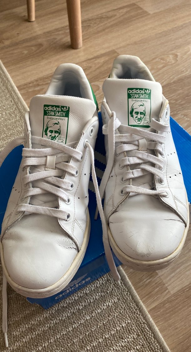 Beyaz Adidas Stan Smith erkek spor ayakkabıları, bağcıklı ve topuksuz tabanlıdır. Kusurları fotoğraflarda gösterilmiştir. Yüklediğim diğer ayakkabılarla beraber almanız durumunda indirim yapabilirim.