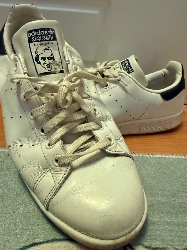 Beyaz Adidas Stan Smith spor ayakkabılar, parlak yüzey ve kauçuk taban ile klasik ve şık bir spor tarz sunar.
