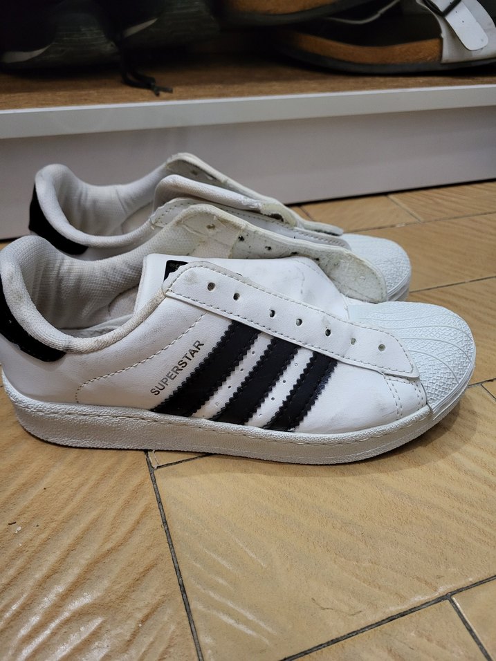 Beyaz Adidas Superstar kadın spor ayakkabısı, siyah çizgilerle ve rahat, hafif tasarımla günlük ve spor kullanıma uygundur. Bagciklari eksik giyilmeye engel bir durumu yoktur.