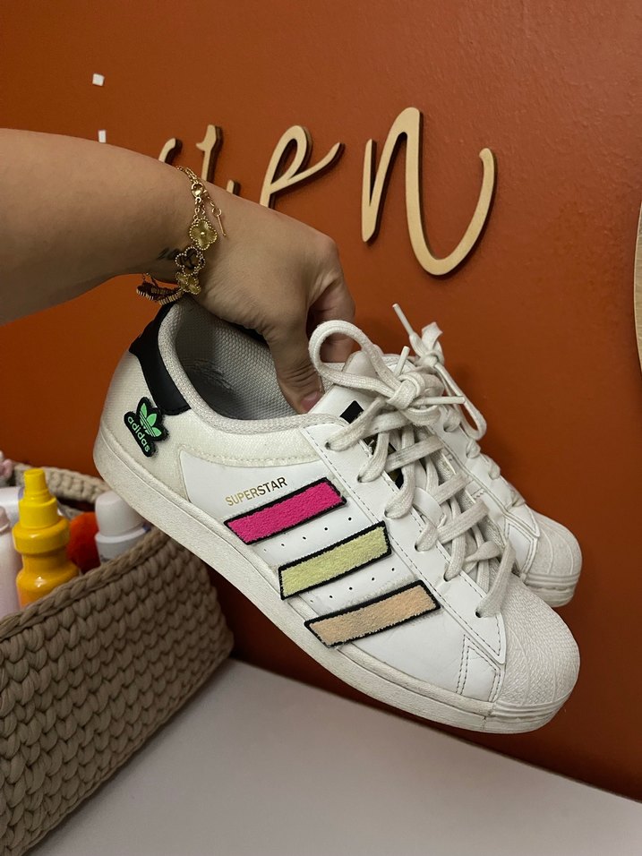 Beyaz Adidas Superstar spor ayakkabılar, pastel renkli baskılı şeritler ve platform topuklu. Kauçuk malzemeden, cırt cırtlı ve spor ile günlük sokak stili için uygun.