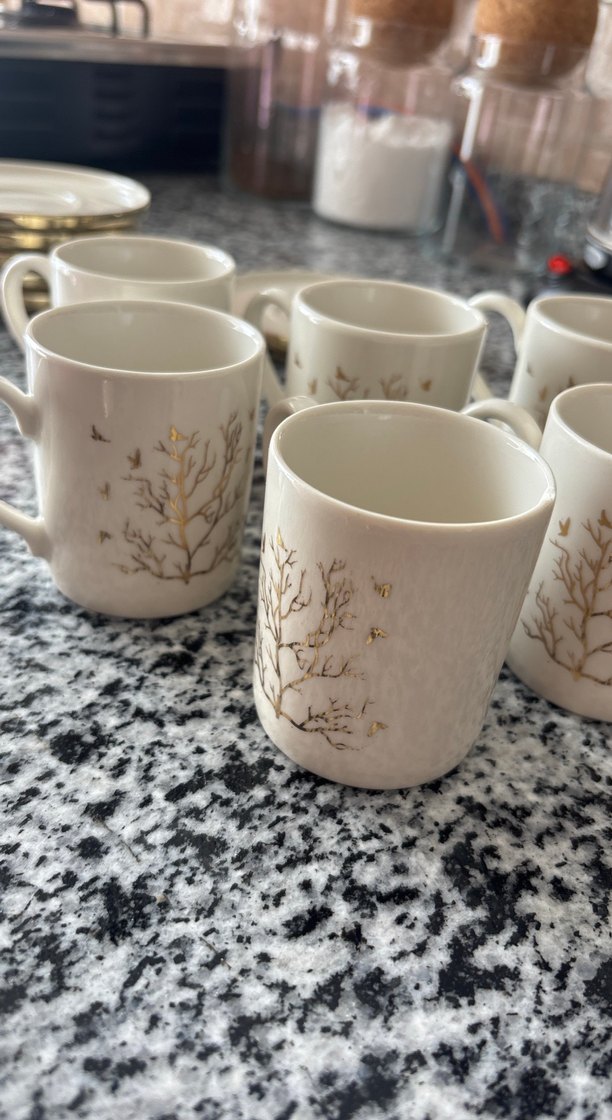 Beyaz seramik fincanlar, gri ve altın detaylı ağaç desenlerine sahip. Pürüzsüz yüzeyli, yuvarlak kulplu, sıcak içecekler için uygun. ☕  sadece 1 tanesinin kısmı kırılmıştır