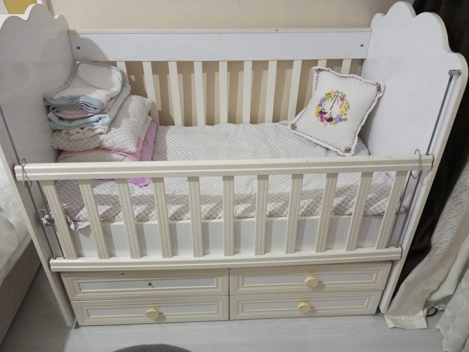 Beyaz ahşap beşik, yanlarda çıtalı tasarım ve alt kısmında iki çekmece ile ekstra depolama sağlar. Pastel tonda, yatak ve yastık dahildir. ️