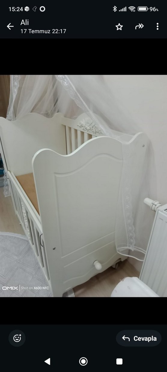 Dantel tül örtülü beyaz ahşap bebek beşiği. Pürüzsüz yüzeyli ve klasik tasarımlı. Marka: OMIX. ️