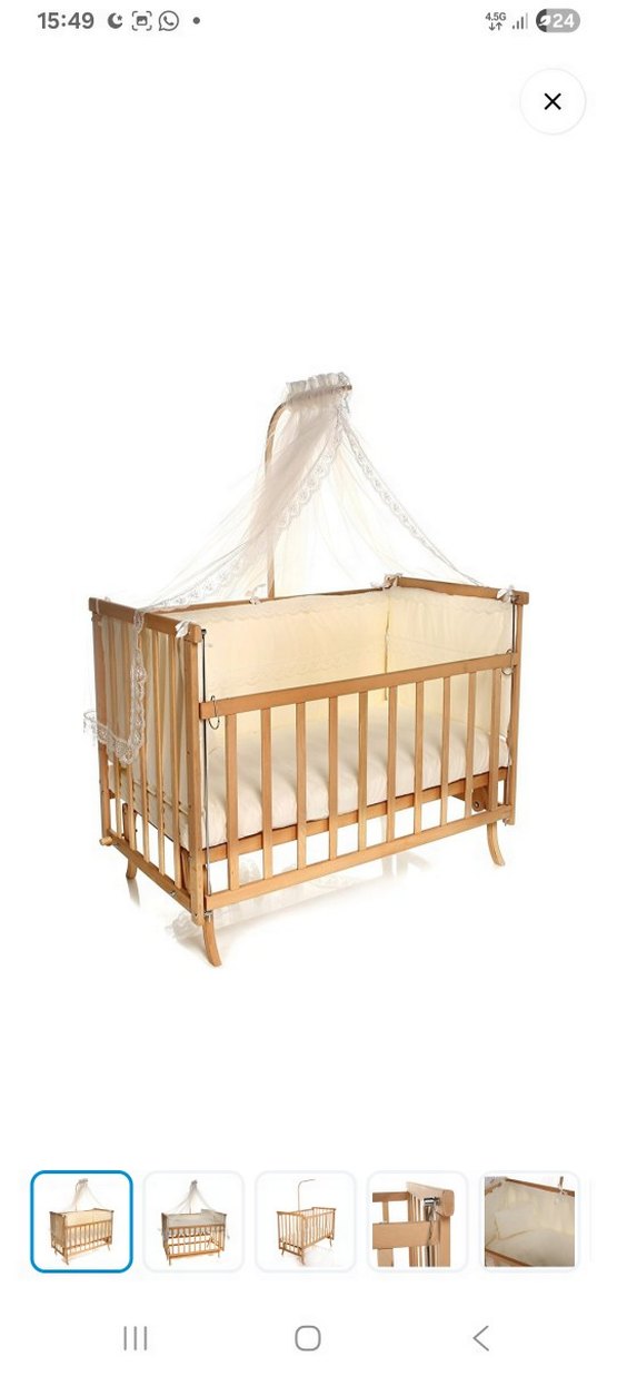 Beyaz ahşap beşik, pastel renkli yatak takımı ve zarif tül perde ile yumuşak ve konforlu bir uyku alanı sunar. ️