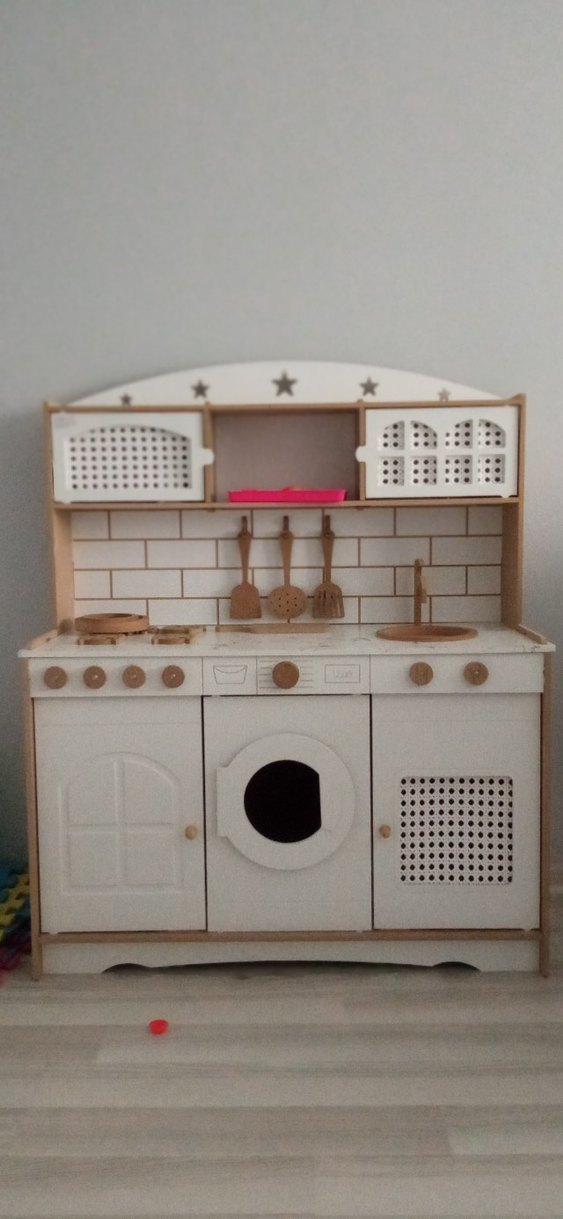 Beyaz ahşap çocuk oyun mutfak seti, dolaplar, ocak, lavabo ve asılı mutfak gereçleri içerir. Yıldız süslemeleri ve çamaşır makinesi kapak tasarımı vardır. Alınali iki hafta oldu oynamiyorlar ihtiyaç fazlası.Bursa içi elden teslim vermek istiyorum