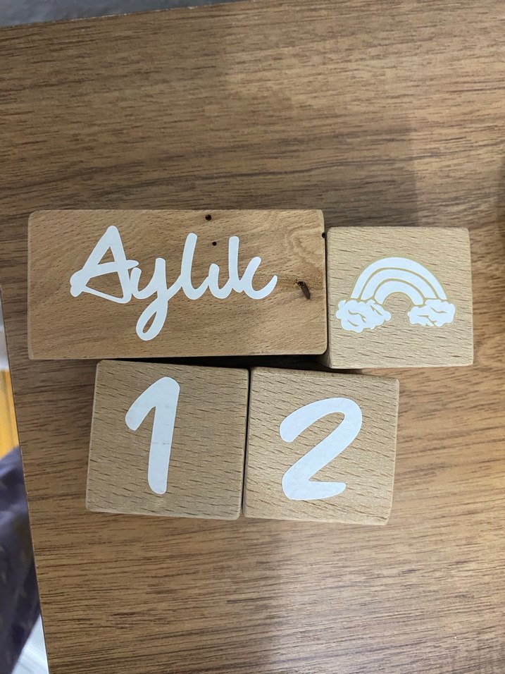 "Aylik" yazılı ve 12 rakamlı, gökkuşağı desenli açık renkli ahşap oyuncak bloklar. Resimde görüldüğü gibi üzerinde siyah noktalar var aldığımda böyle geldi bütün sayılar var