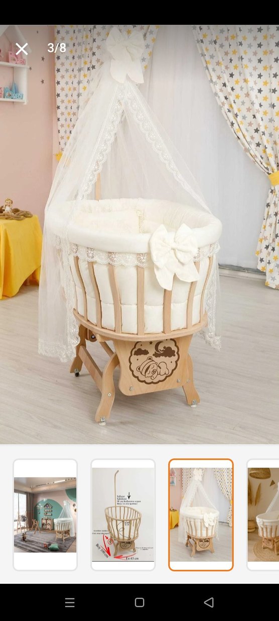 Yumuşak dolgulu kenarları ve süslü fiyonkuyla beyaz ahşap beşik. İnce dantel cibinliği ve tekerlekli sağlam ayak yapısı bulunur. ️