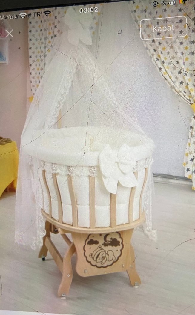 Yumuşak dolgulu beyaz ahşap sepet beşik, dekoratif fiyonk ve narin dantel cibinliği ile bebek için rahat ve şık bir alan sağlar. ️