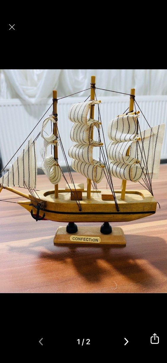 Beyaz ahşap yelkenli gemi figürü, siyah çizgili detaylı yelkenlere ve tabanda 'CONFECTION' yazan etikete sahiptir. ⛵