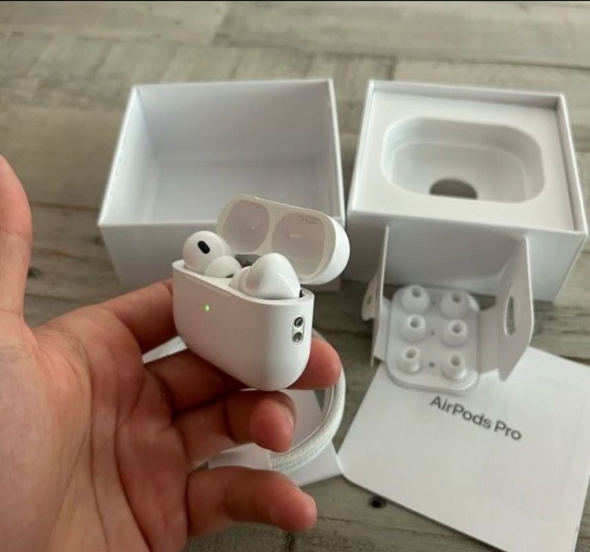 Beyaz AirPods kablosuz kulaklık, şarj kutusu ve ekstra kulak uçları ile birlikte gelir. Rahat kullanım sağlar.