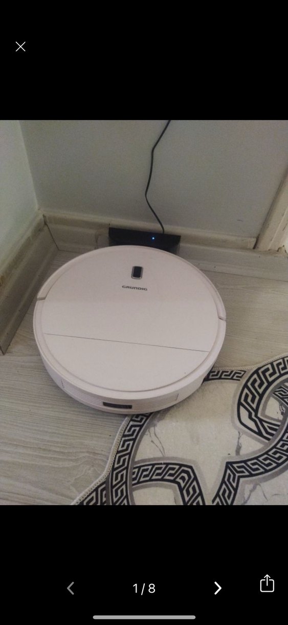 Şarj istasyonunda duran beyaz robot süpürge, farklı yüzeylerde otomatik temizlik yapar.