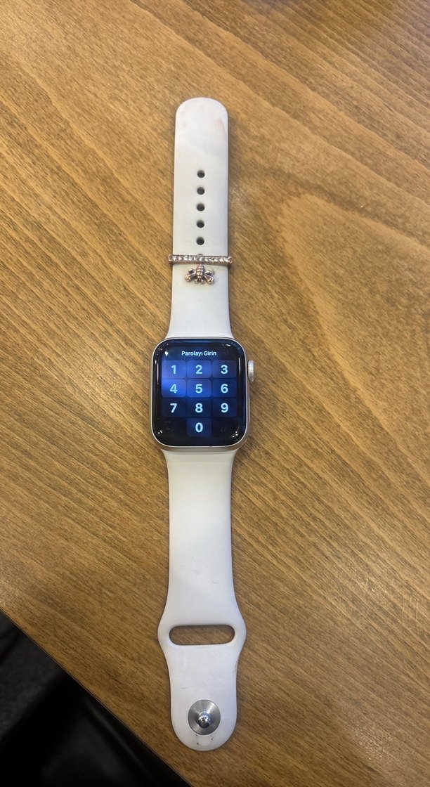 Gri ekranında 2,3,5 ve 8 rakamlarının olduğu beyaz kayışlı akıllı saat. Kayışta dekoratif bir aksesuar bulunur.⌚Apple watch SE garantisi devam ediyor 19 Temmuz 2027 kadar garantisi devam ediyor çok az kullandım herhangi bir hasarı yoktur ekranında kırılmaz çizilmez cam vardır aksesuarı da hediye ediyorum :)
