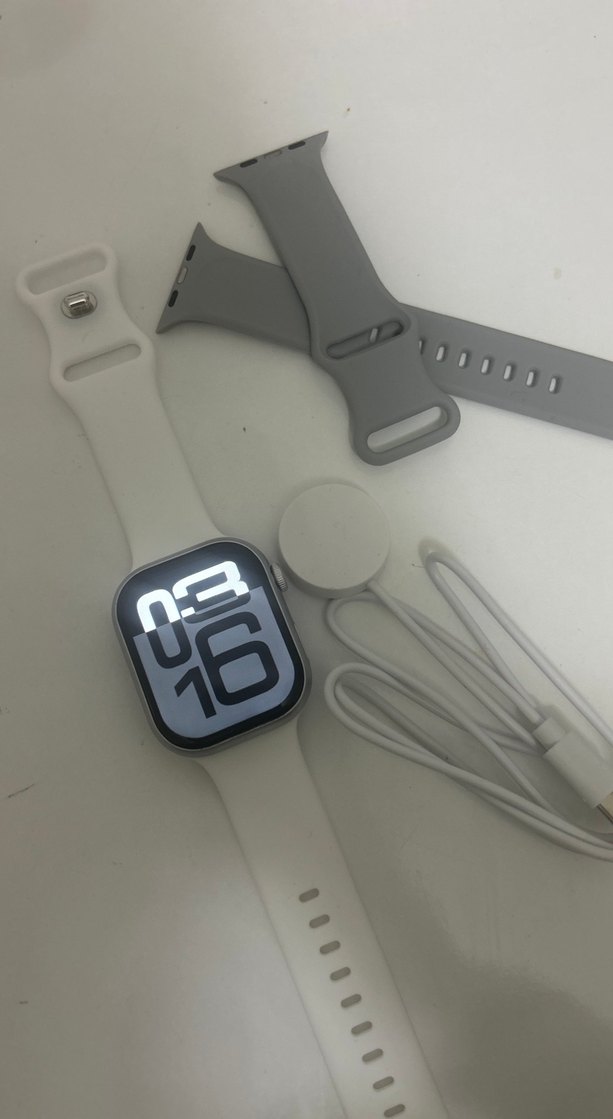 Beyaz akıllı saat, net dijital ekran ve ekstra gri kayış ile birlikte. Manyetik şarj cihazı ve USB kablosu içerir. Ekranda 03:16 saati gösteriliyor. ⌚