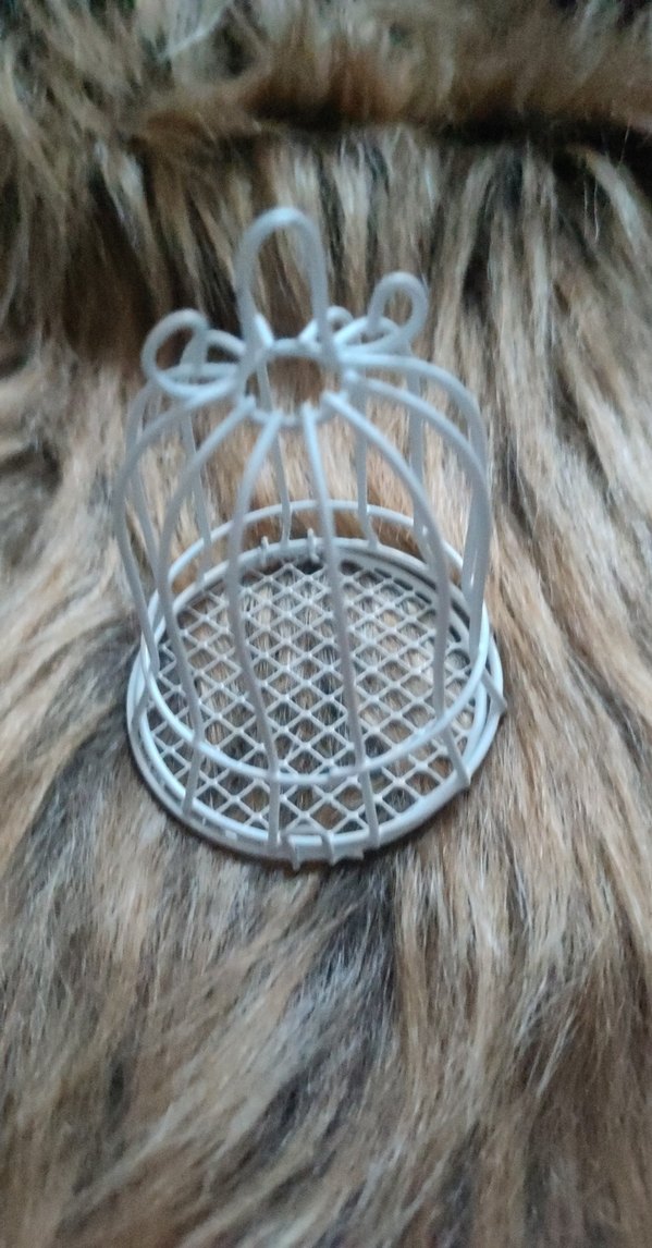 Beyaz renkte, kafes şeklinde aksesuar Dayanıklı malzemeden yapılmış, tabanında örgü desen ve üstte askısı var