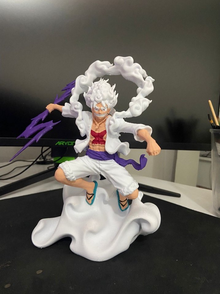 Beyaz kıyafet ve saçlarla dinamik pozda, etrafında duman ve mor yıldırım efektleriyle aksiyon figürü. Beyaz taban üzerinde duruyor. ⚡