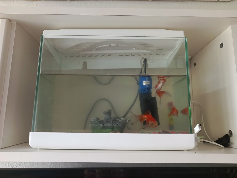 Beyaz kapak ve tabana sahip, ve sualtı filtresi bulunan şeffaf su dolu akvaryum tankı. İzmir Buca elden teslim Kargo yok