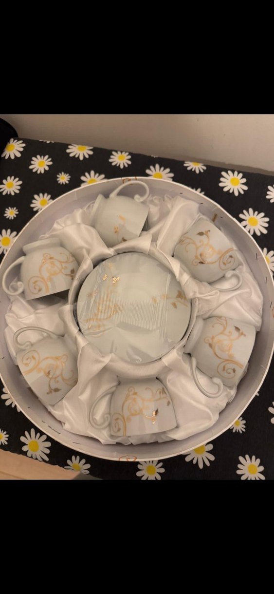 Saten astarlı yuvarlak kutuda, altın desenli beyaz 6 kahve fincanı seti. ☕