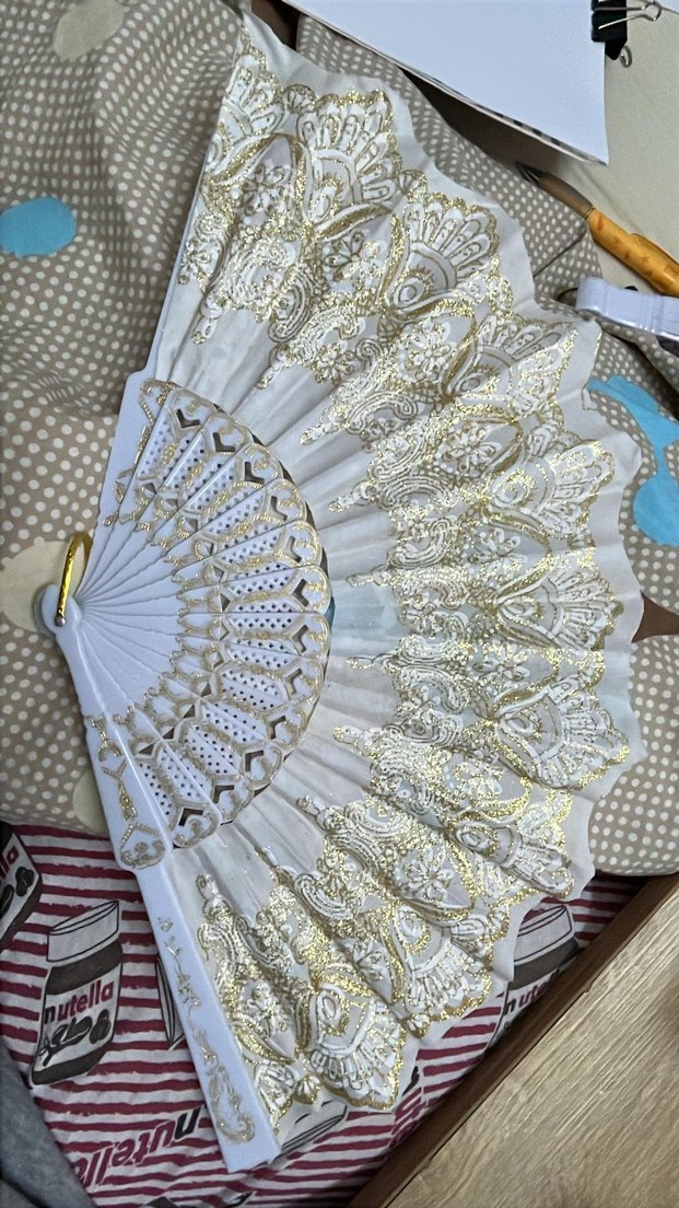 Bu beyaz katlanabilir yelpaze, zarif altın desenlere ve hafif yapıya sahiptir. ️