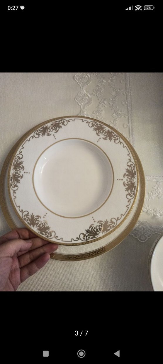 Yemek servisi için kenarında parlak altın desenli beyaz yemek tabağı. ️