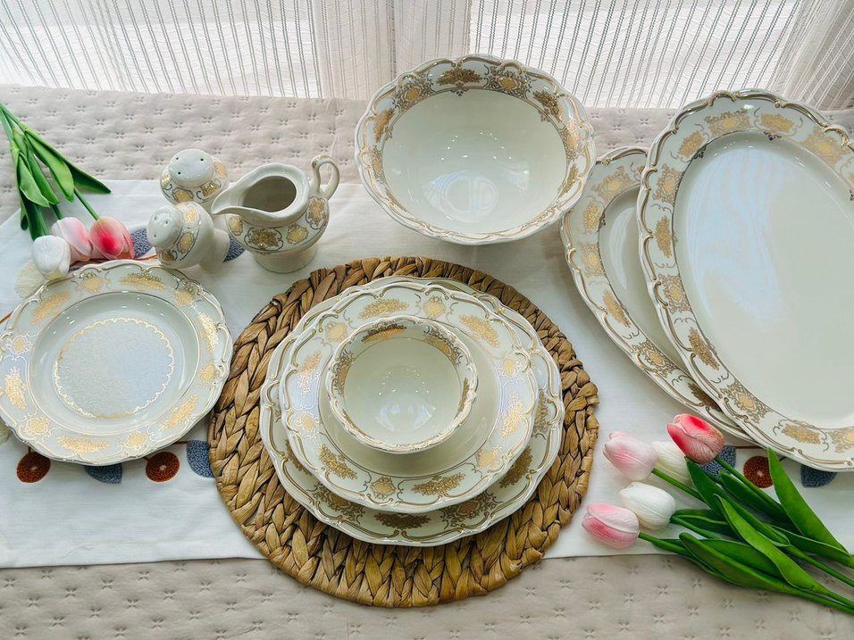 Altın desenli beyaz yemek takımı, çeşitli kase ve tabaklardan oluşmaktadır. Şık ve zarif sunumlar için uygundur. ️