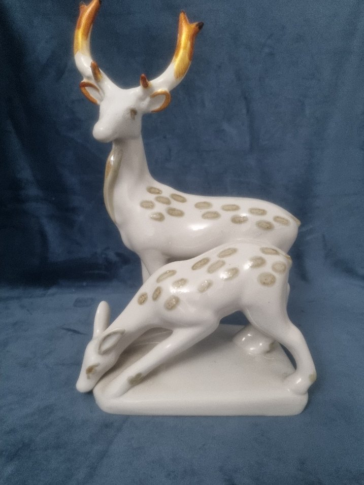 Altın detaylı boynuzlara ve beneklere sahip beyaz geyik figürleri, pürüzsüz yüzeyle tasarlanmıştır.