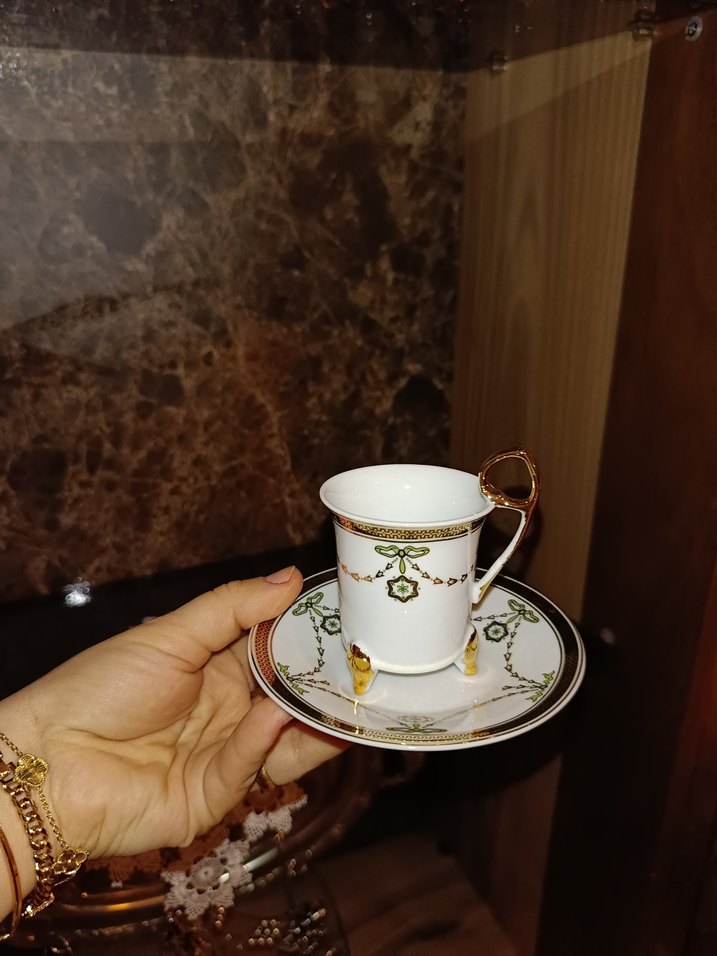 Altın detaylı beyaz kahve fincanı ve tabağı, zarif yeşil desenlerle süslenmiştir. ☕