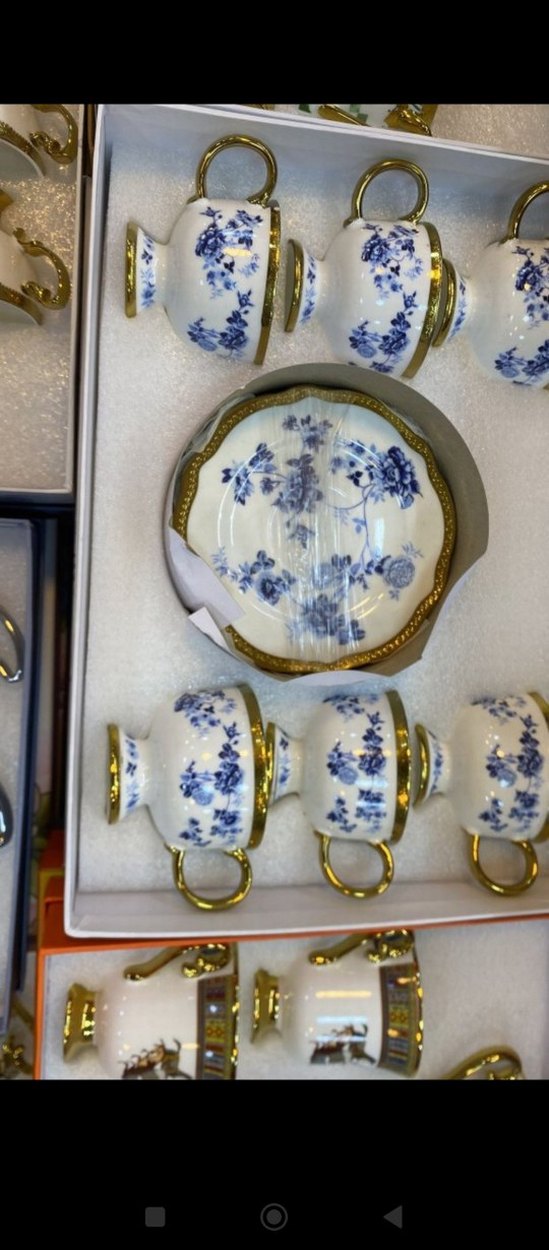Beyaz zemin üzerine mavi çiçek desenleri ve altın detaylarla süslenmiş şık çay fincanı seti ☕.
