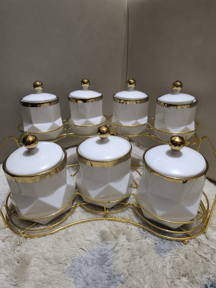 Altın detaylı beyaz mutfak baharatlıkları, yuvarlak düğmeli kapaklar ve düzenli saklama için altın raf içerir. ️