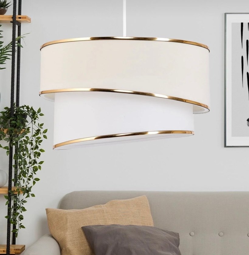 Katmanlı tasarıma sahip beyaz sarkıt avize, altın detaylarla modern bir dokunuş sağlar. Beyaz kabloyla asılır ve yumuşak ışık verir.