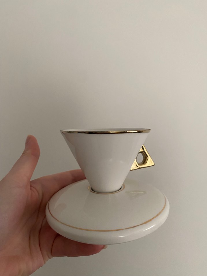 Altın detaylı, üçgen saplı beyaz seramik fincan, şıklığı ve sadeliği bir arada sunar. ☕ 6 kişilik