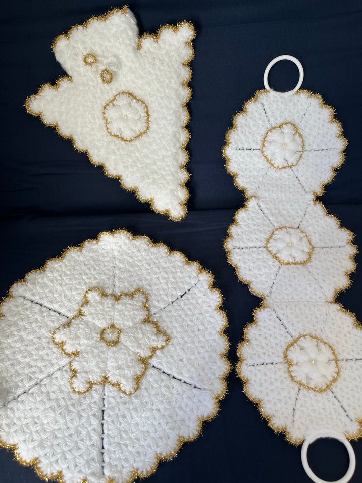 Altın işlemeli beyaz örgüden yapılmış, farklı şekil ve askı halkaları bulunan üç el sanatları parçası seti.